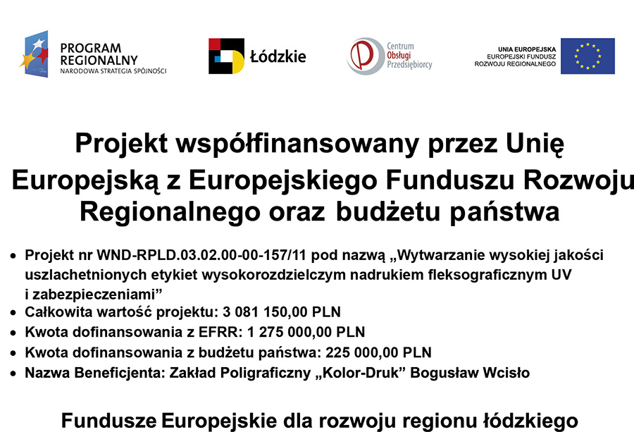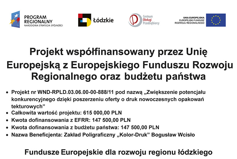 Zakład Poligraficzny „Kolor-Druk” Bogusław Wcisło realizuje projekt dofinansowany z Funduszy Europejskich pn. „Wprowadzenie na rynek innowacyjnych opakowań z nadrukiem ozdobnym”.