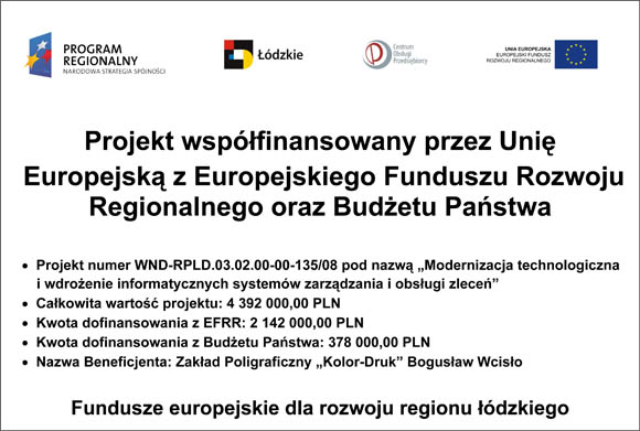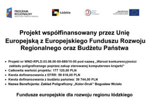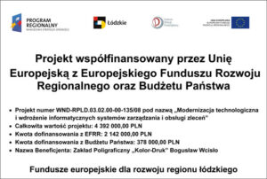 Zakład Poligraficzny „Kolor-Druk” Bogusław Wcisło realizuje projekt współfinansowany w ramach Regionalnego Programu Operacyjnego Województwa Łódzkiego na lata 2014-2020 (Oś priorytetowa II: Innowacyjna i konkurencyjna gospodarka).