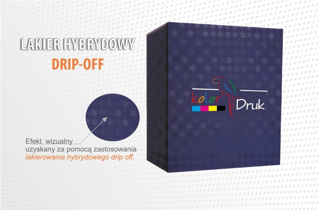 Wprowadziliśmy do naszej oferty innowacyjne opakowania z nadrukiem ozdobnym. Lakier hybrydowy DRIP-OFF pozwala na uszlachetnienie powierzchni druku za pomocą dwóch wizualnie różnych lakierów (błysk + mat). Lakierowanie to pozwala na uzyskanie unikatowej struktury „skórki pomarańczy” i wysokiego połysku. Odróżni to Państwa projekt od pozostałych, uszlachetnianych tradycyjnie, dzięki czemu produkt stanie się wyjątkowy na rynku.
